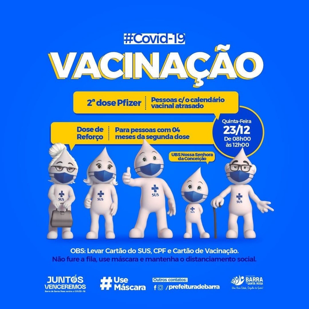2° dose e dose de reforço da vacina contra a COVID-19 ocorrerá na próxima quinta-feira dia 23 de dezembro. Não esquecer a documentação necessária informada na postagem acima!