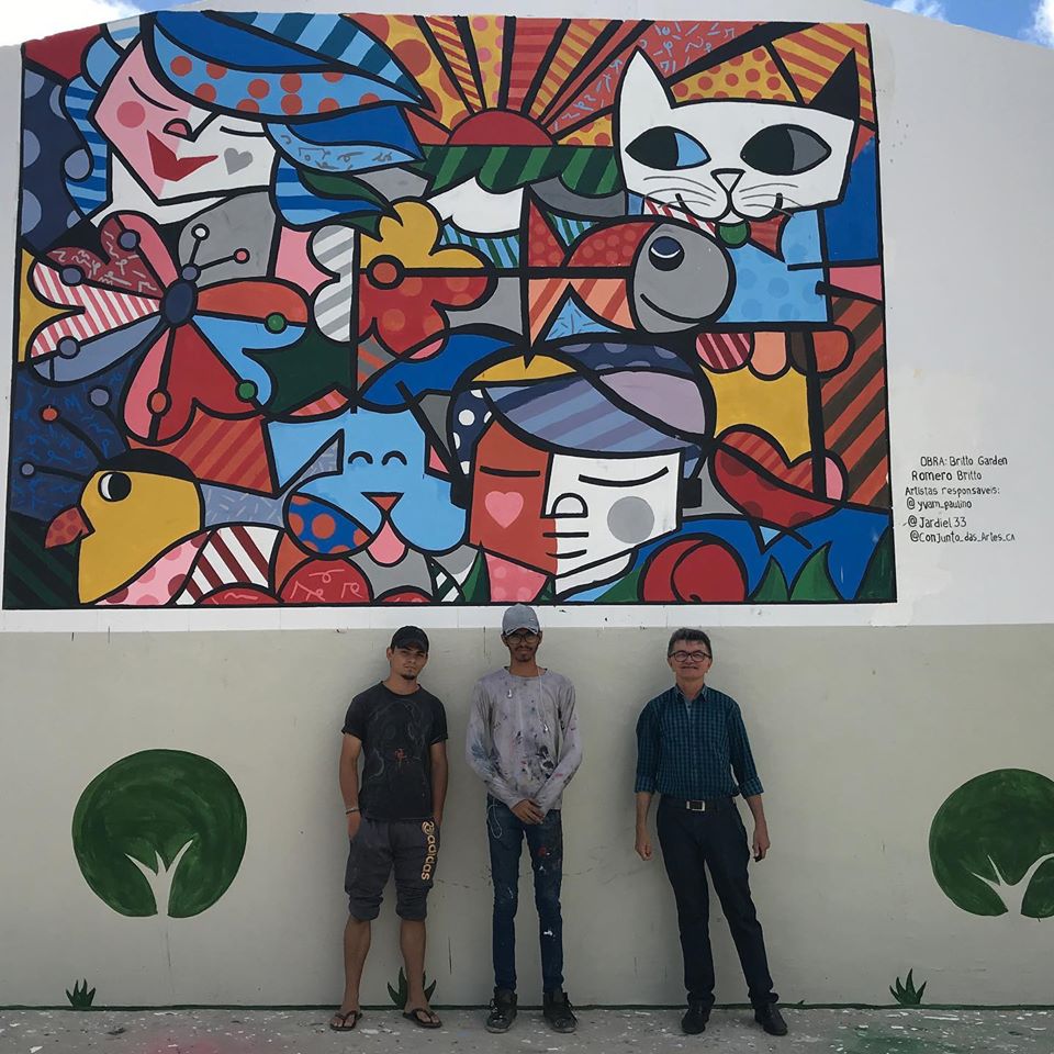 Os jovens artistas fizeram uma reprodução do trabalho de um dos maiores artistas brasileiros, Romero Brito, na parede externa da Escola Municipal Pingo de Gente.