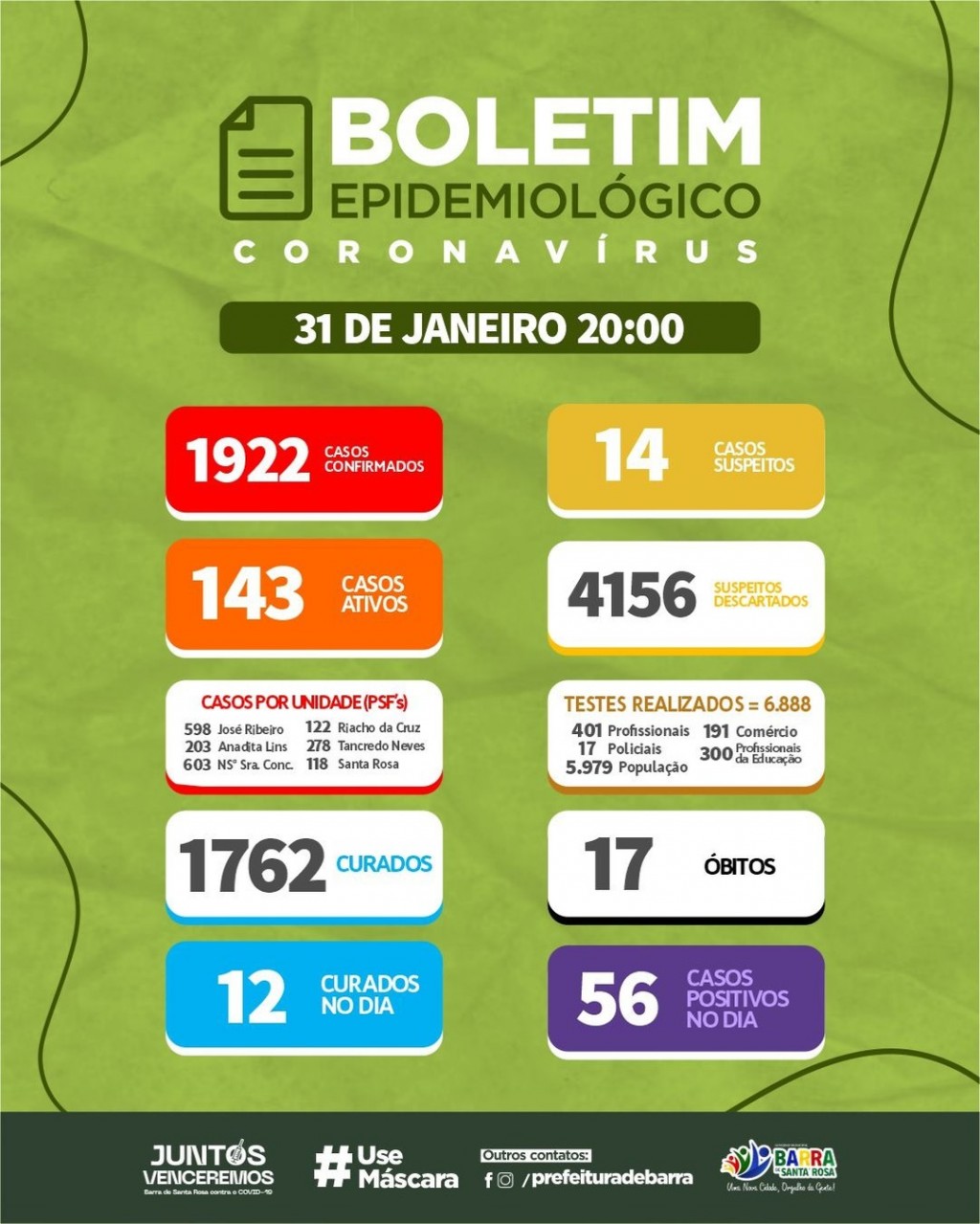 Segue o boletim epidemiológico desta segunda-feira (31).