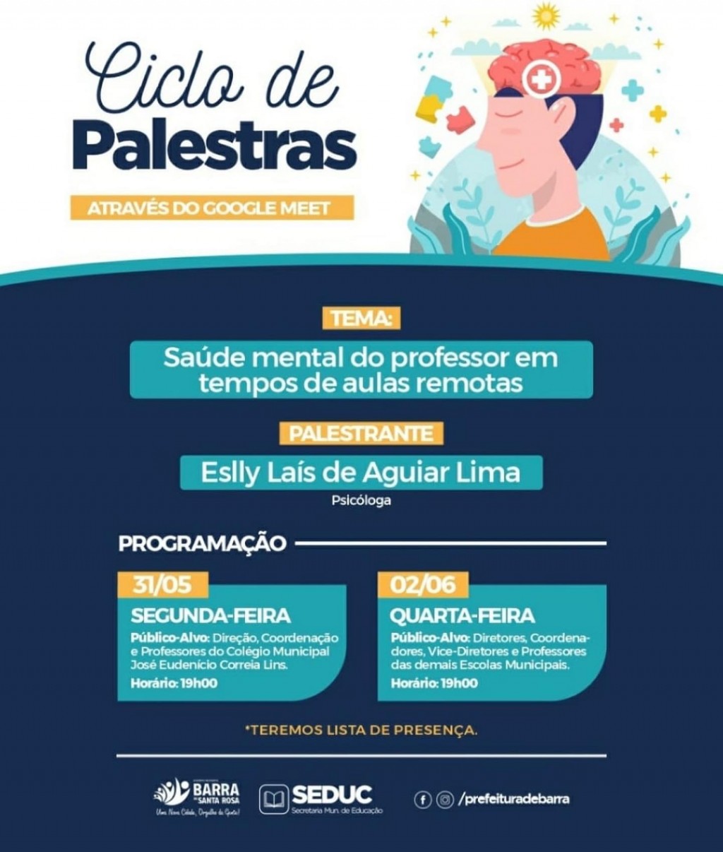 A Secretaria de Educação Municipal estará realizando nas próximas semanas, com os professores municipais, um ciclo de palestras e a segunda formação de Língua Portuguesa e de Matemática do Programa Integra Educação PB, sempre na busca de subsídios que tragam um aprimoramento e uma efetiva formação continuada.