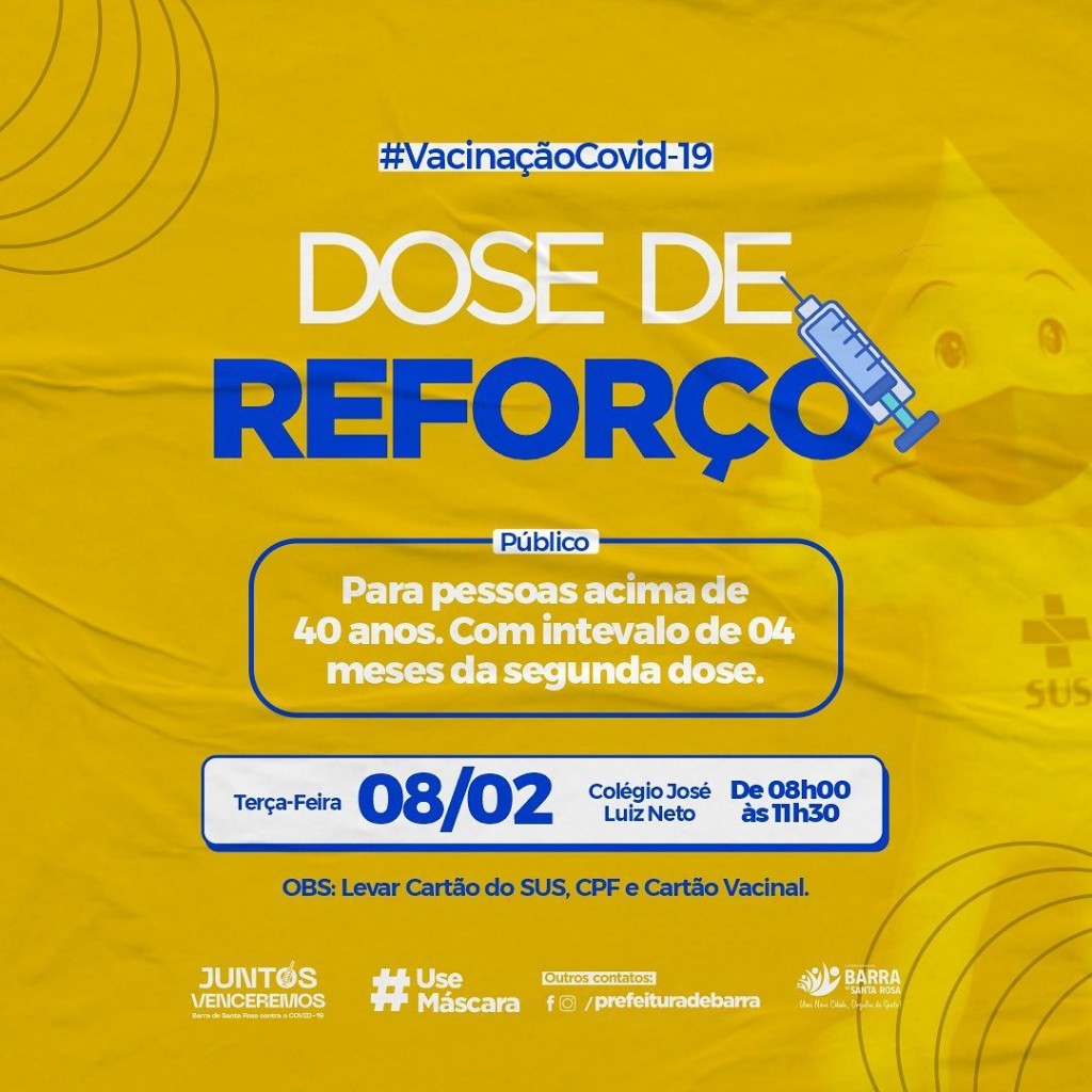 A vacinação contra a Covid-19 nesta terça-feira (08), é destinada à dose de reforço para pessoas com 40 anos ou mais que tomaram a segunda dose há quatro meses ou mais.