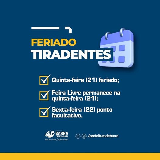 Informamos também que além do feriado Nacional de Tiradentes na quinta-feira (21), o Governo Municipal decreta ponto facultativo na sexta-feira, dia 22.