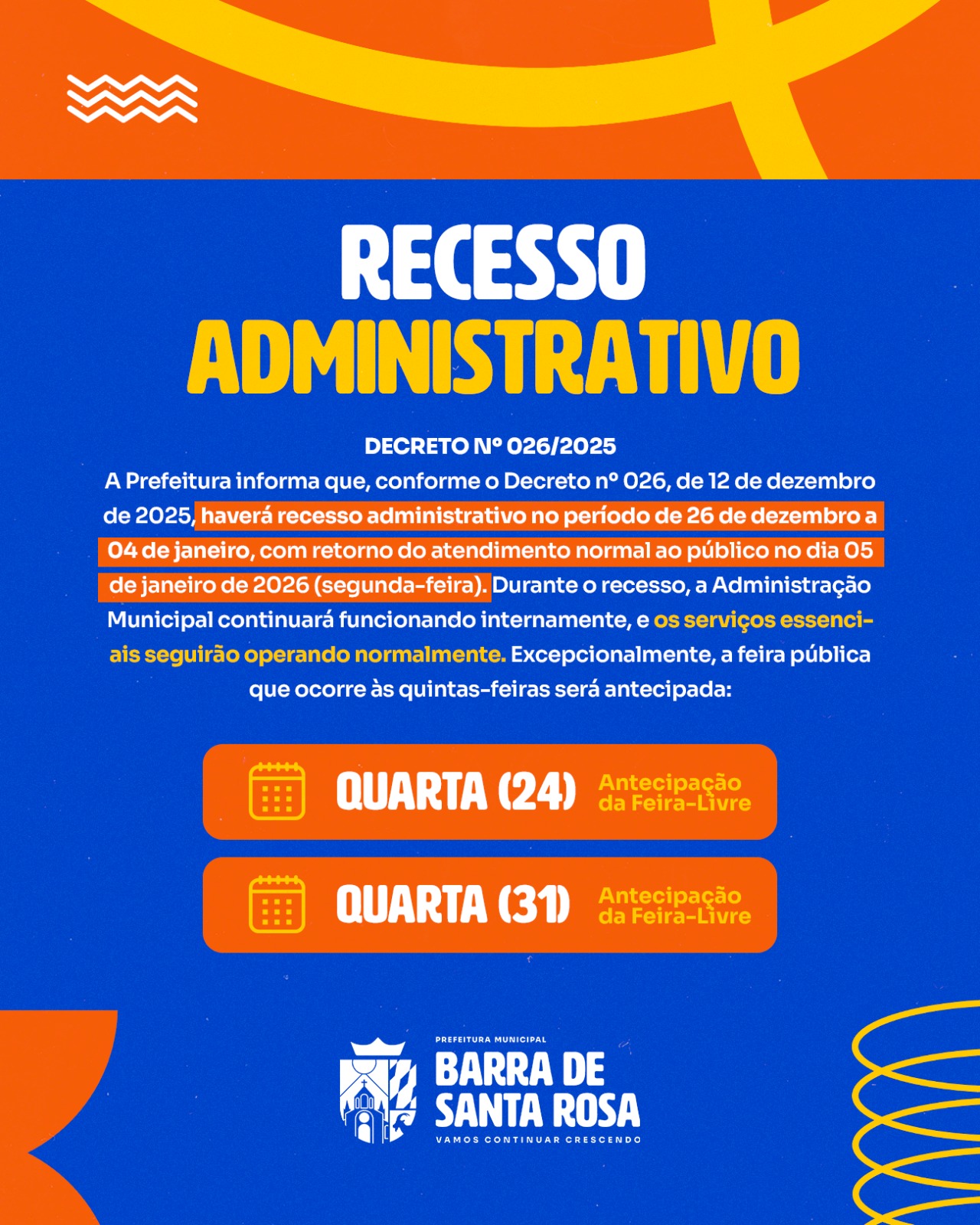 A Prefeitura de Barra de Santa Rosa informa que, conforme o Decreto nº 026/2025, haverá recesso administrativo no período de 26 de dezembro a 04 de janeiro, com retorno do atendimento normal ao público no dia 05 de janeiro de 2026 (segunda-feira).