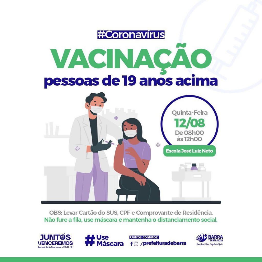 Pessoas com 19 anos acima irão receber a primeira dose da vacina contra COVID-19 nesta próxima quinta-feira (12).