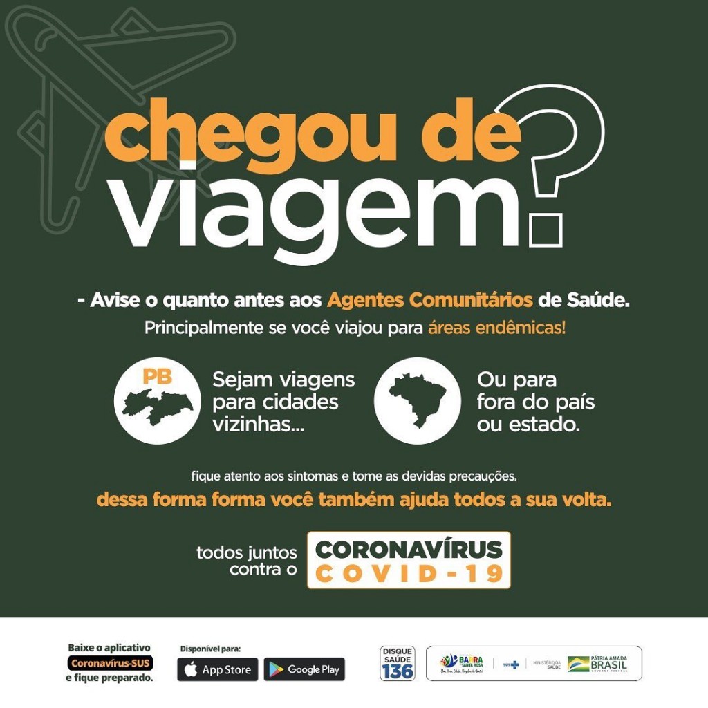 Não importa para onde viajou ou de onde está recebendo visita, AVISE AO SEU AGENTE COMUNITÁRIO, respeite a quarentena de 7 dias para pessoas que vem de cidades onde não há registro de casos e 15 dias para os que vem de cidades que apresentam algum caso.
