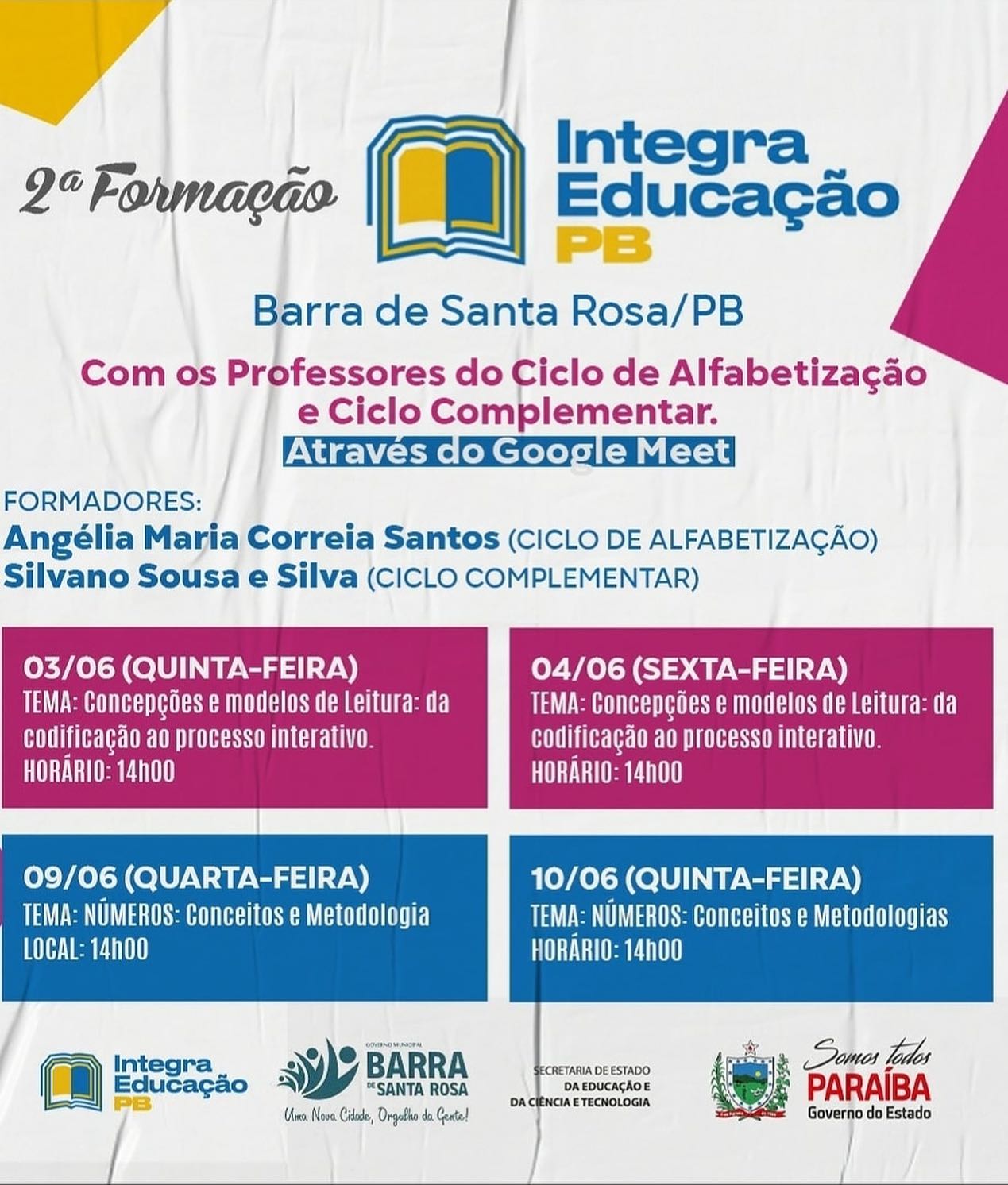 A Secretaria de Educação Municipal estará realizando nas próximas semanas, com os professores municipais, um ciclo de palestras e a segunda formação de Língua Portuguesa e de Matemática do Programa Integra Educação PB, sempre na busca de subsídios que tragam um aprimoramento e uma efetiva formação continuada.