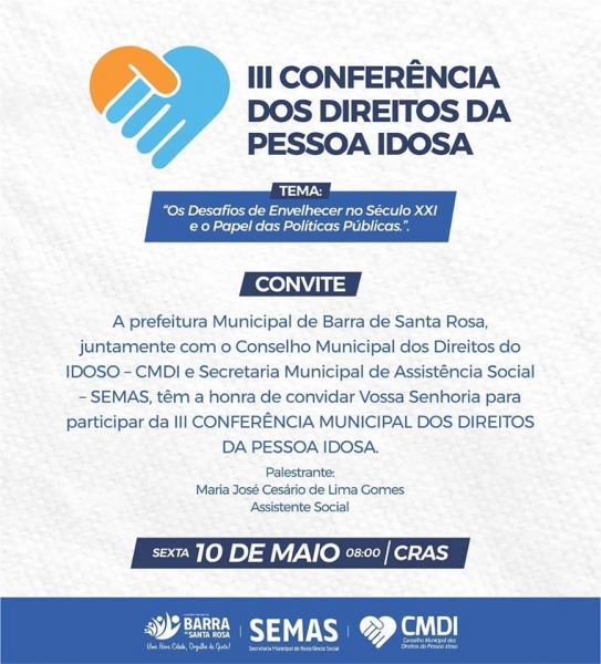 Nesta sexta (10), no prédio do CRAS, às 8:00hrs da manhã. III Conferência dos Direitos da Pessoa Idosa, tendo como tema “Os desafios de Envelhecer no Século XXI e o Papel das Politicas Públicas.”