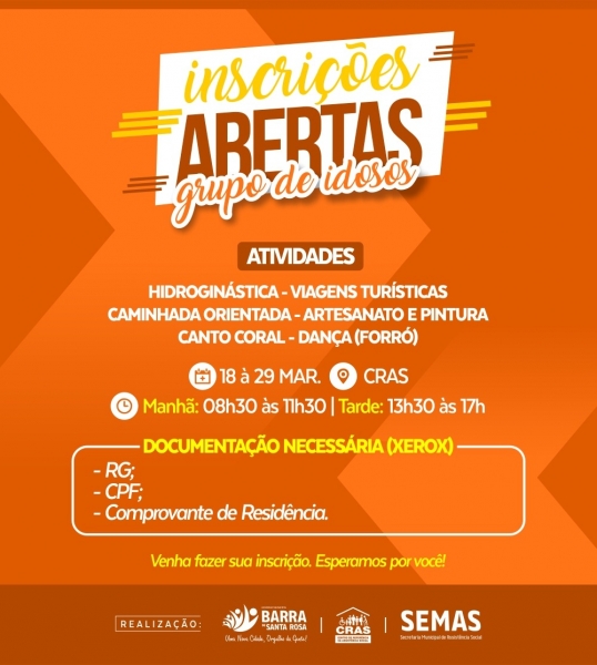 As inscrições estão abertas para participar do Grupo de Idosos. A prefeitura em parceria com o CRAS e SEMAS, está oferecendo esse projeto para os idosos realizarem as seguintes atividades: hidroginástica, viagens turísticas, caminhada orientada, artesanato e pintura, canto coral e dança (forró).